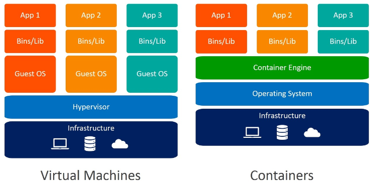 | Docker는 컨테이너화 된 애플리케이션을 실행합니다. 컨테이너는 호스트 OS의 커널을 공유하며 각 컨테이너는 시스템의 나머지 부분으로부터 격리된 환경에서 실행됩니다. | VM은 물리적 하드웨어 위에 하이퍼바이저를 사용하여 별도의 전체 운영체제를 실행합니다. 완전히 독립된 가상의 컴퓨터를 의미합니다. |