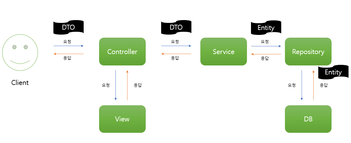 - DTO는 값의 전달의 역할로써 Controller <-> View 구간, Controller <-> Service 구간에서 주로 이루어지며 Entity는 Service <-> Repository 구간에서 사용합니다.